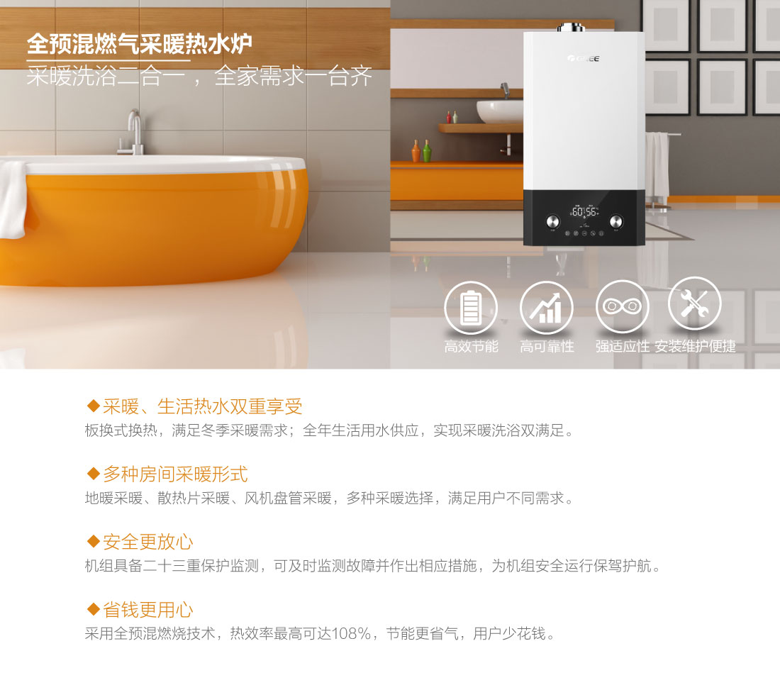 全預混燃燒結(jié)合雙寬域功率調(diào)節(jié),節(jié)能恒溫,溫差在±0.5℃之間,保證熱水四季恒溫快速出熱水,減少水流浪費,生活水溫度35-60℃,采暖水溫30-80℃